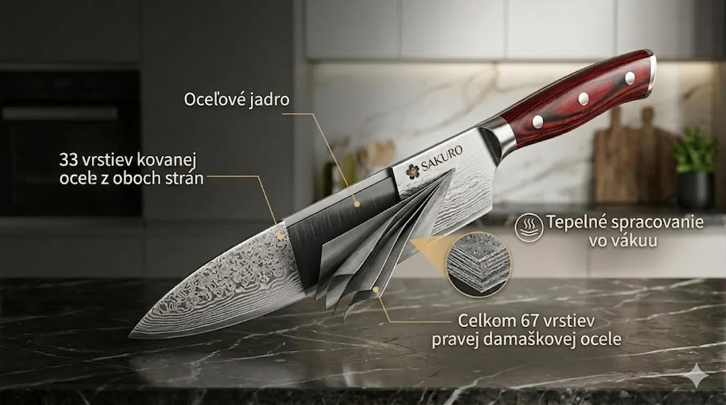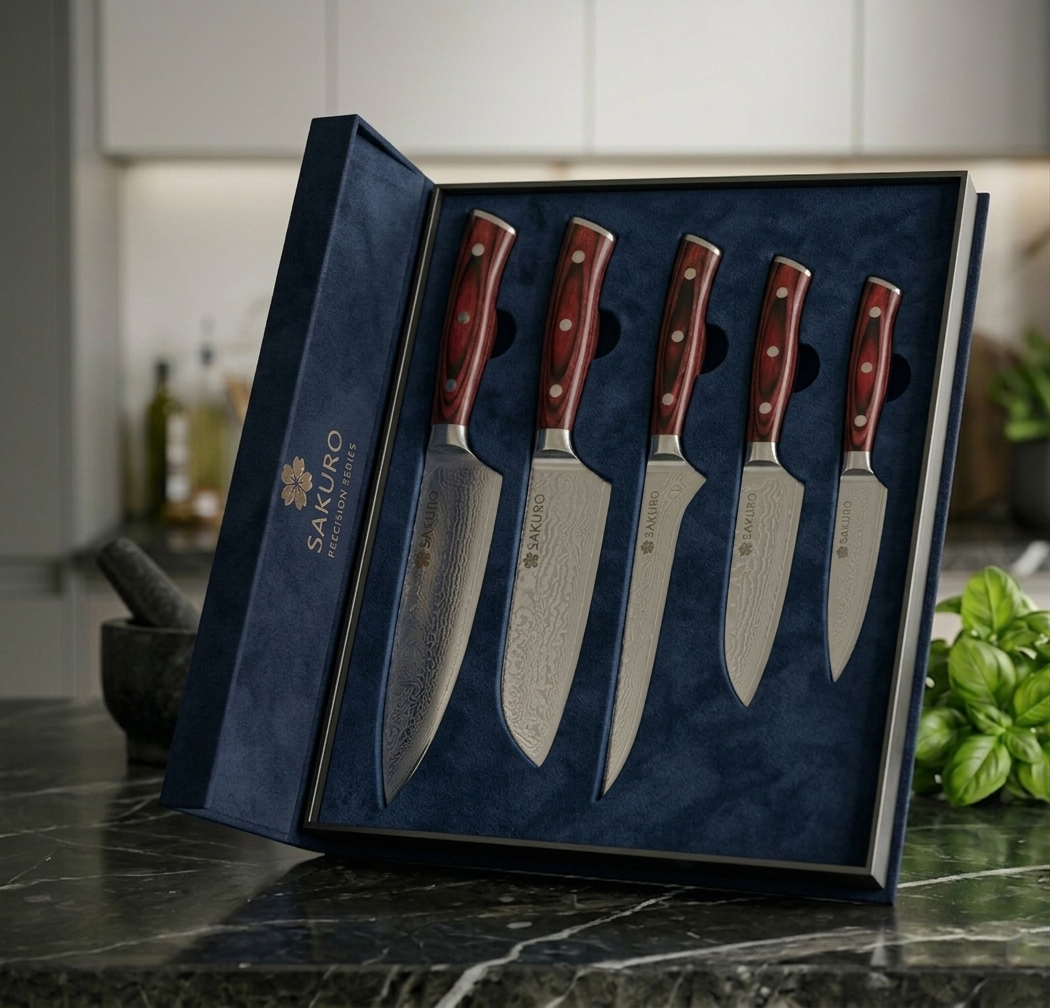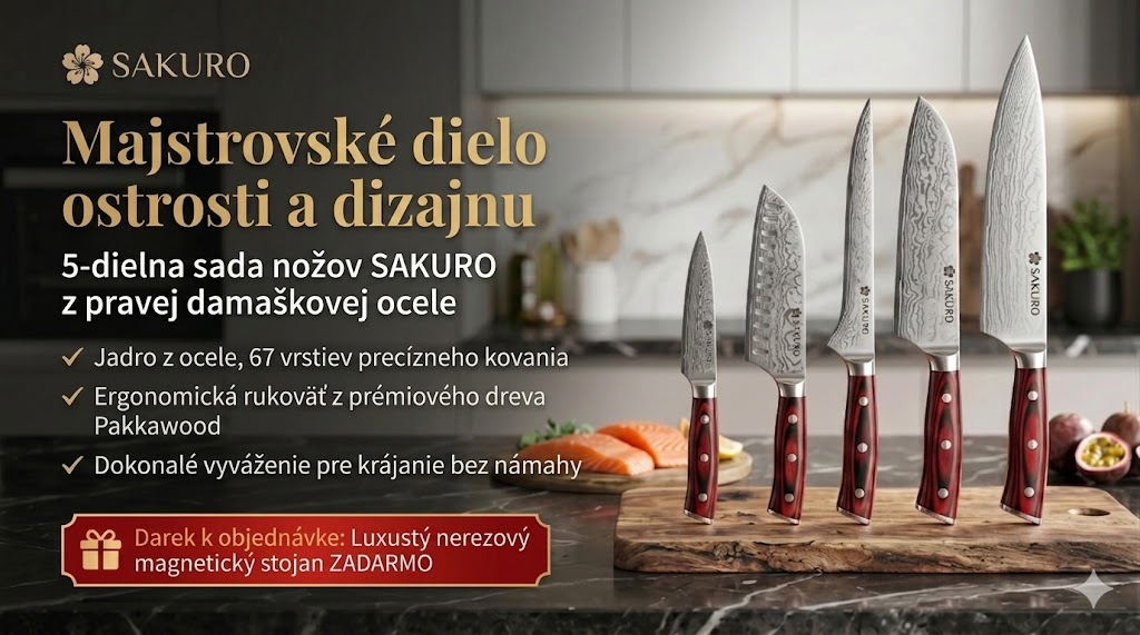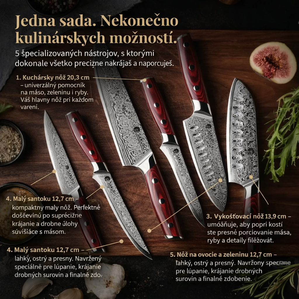 🔪 Luxusná 5-dielna sada nožov SAKURO z pravého damaškového ocele + 🎁 Stojan ZADARMO